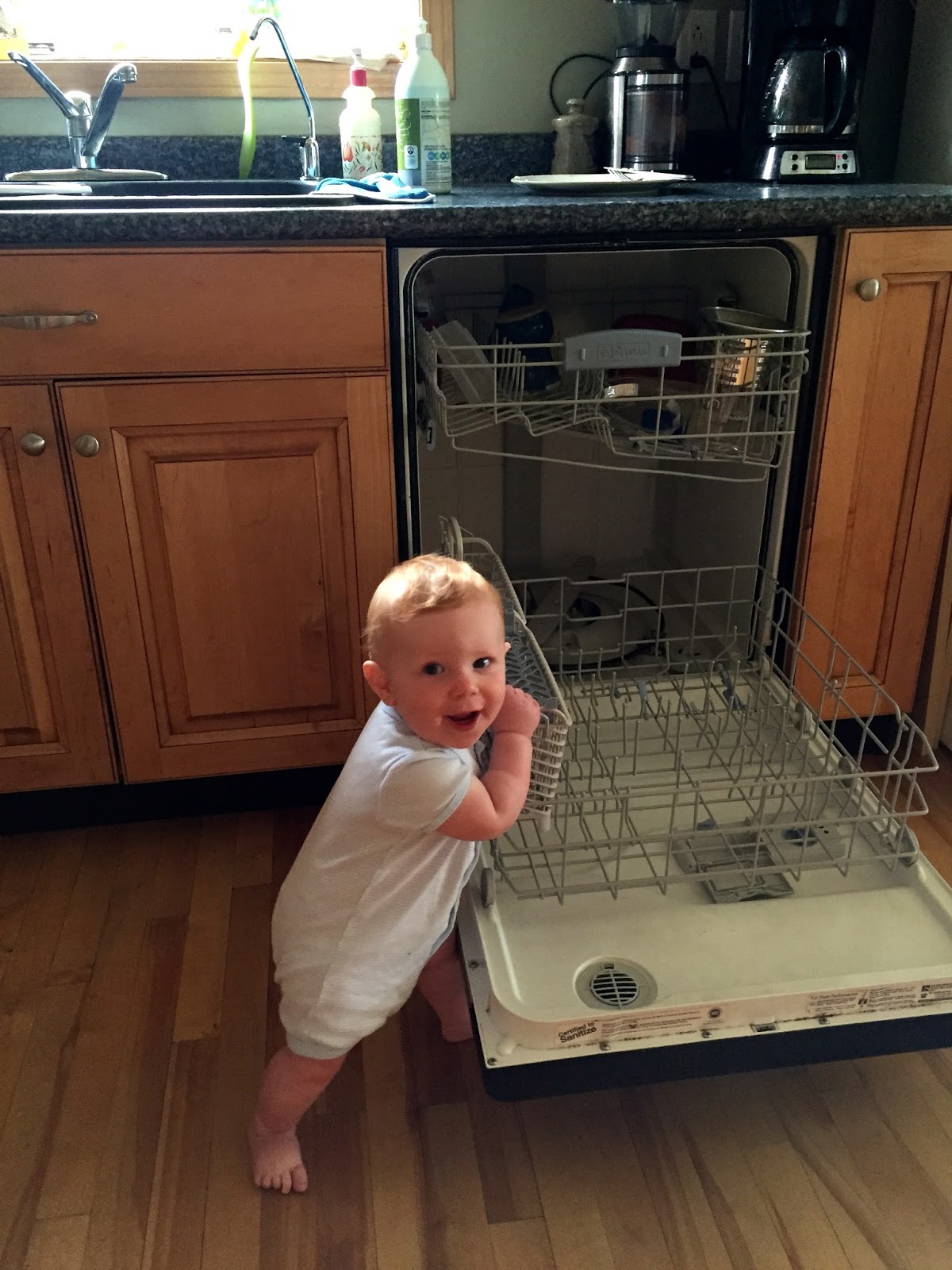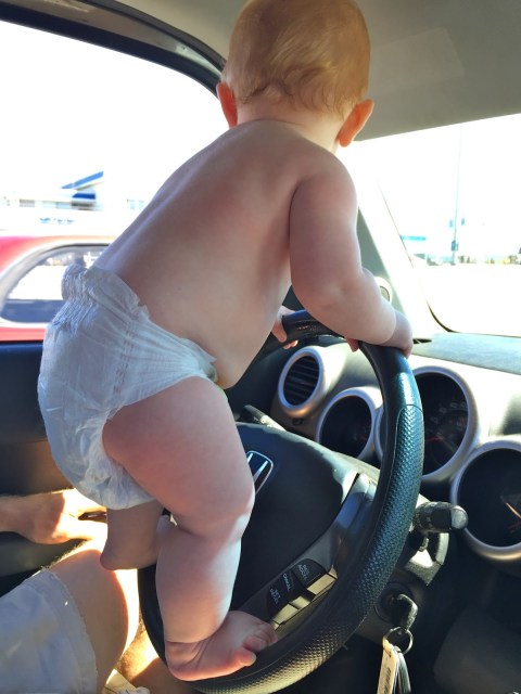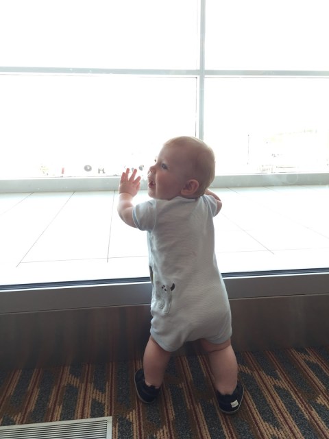 The morning of our departure, I was running around doing last minute house chores. As I unloaded the dishwasher, Henry was crawling around the kitchen. Then, without any hesitation, he crawled up the the dishwasher door and pulled himself up to standing. Just like that! I knew I was in for it then!