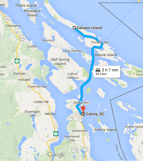 | Our ferry route from Galiano Island to Sidney, Vancouver Island |