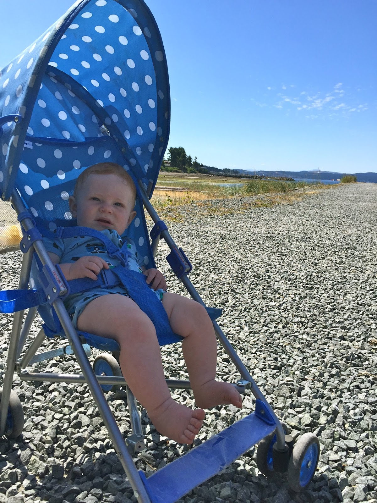 Once on the ferry, we settled Henry into his little tent for a nap while Blake and I watched the beautiful scenery as we sailed by. We landed in Sidney on Vancouver Island in the late afternoon, just in time to find a cute ocean-side restaurant where we ate a seafood feast of scallops, shrimp and salmon. Henry loved it all! We bunked down for the night in a pretty dingy Econolodge where I was nervous to even let Henry touch the carpet. Ew! Blake and I kept saying, ‘if we are ever rich, we’re going to splurge for nice hotel rooms and an air conditioned car!’ 🙂