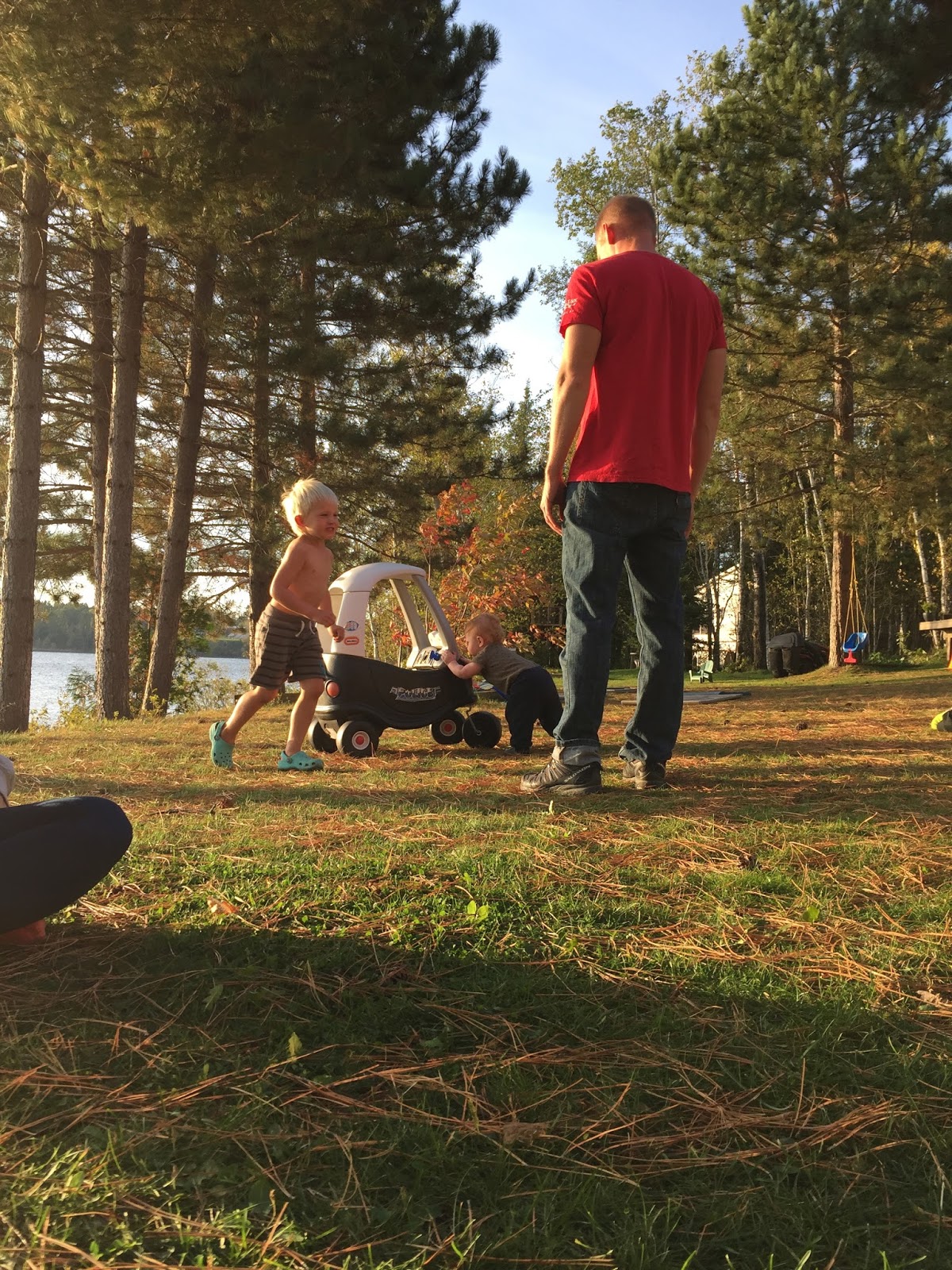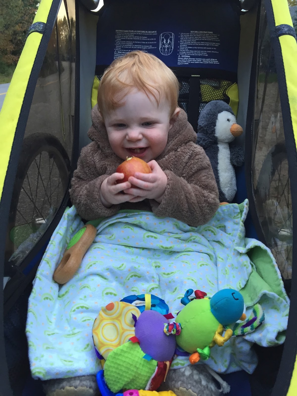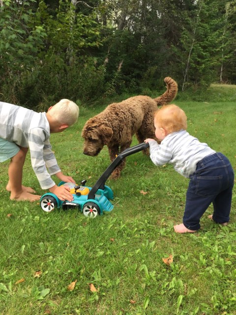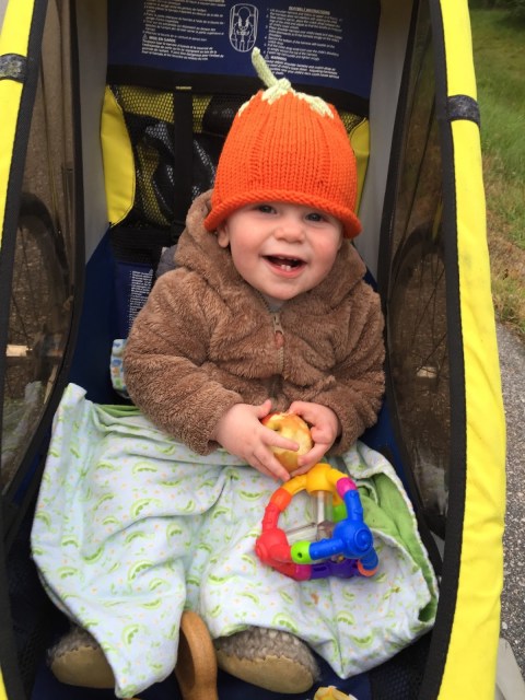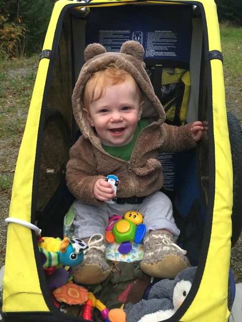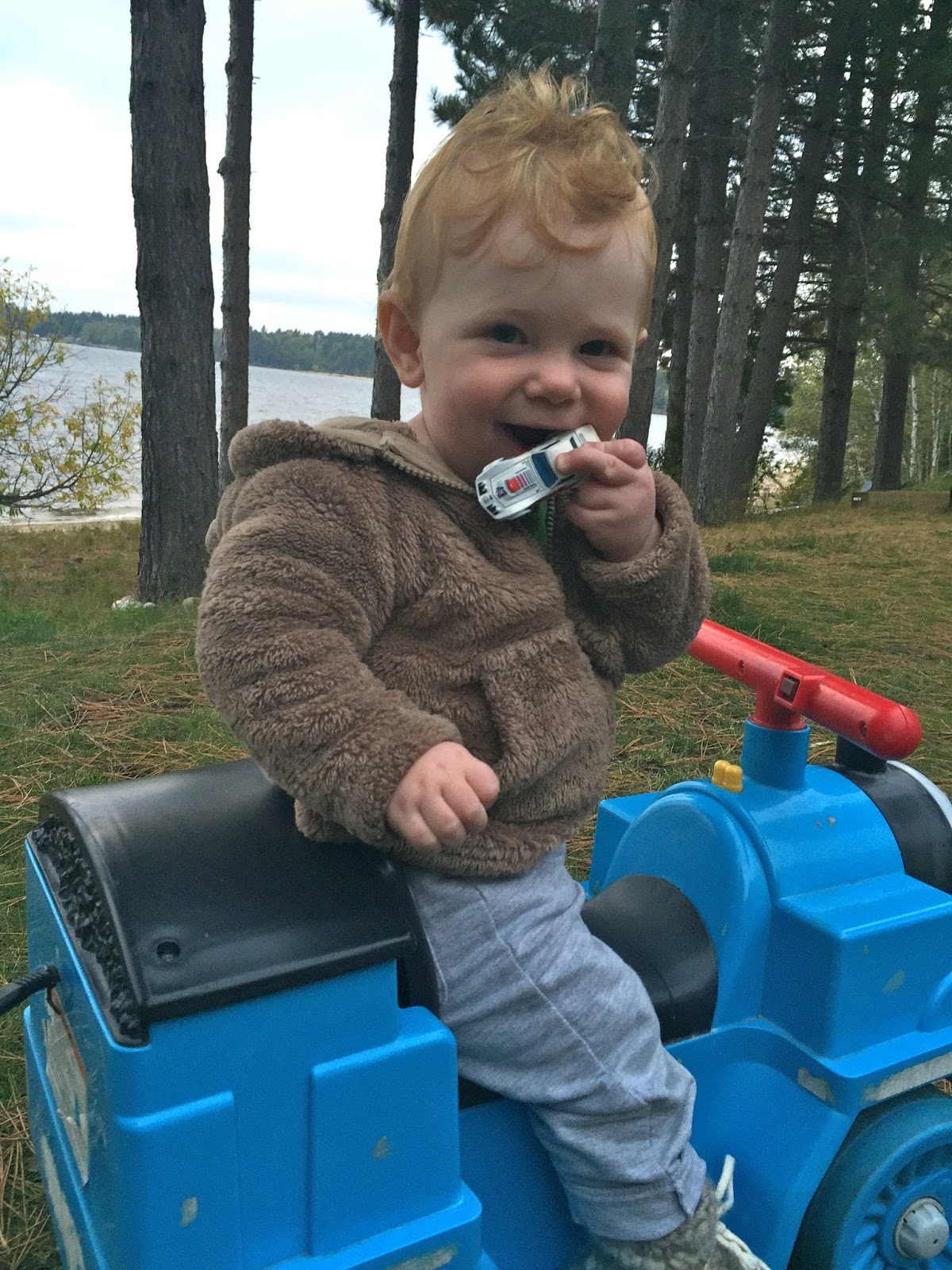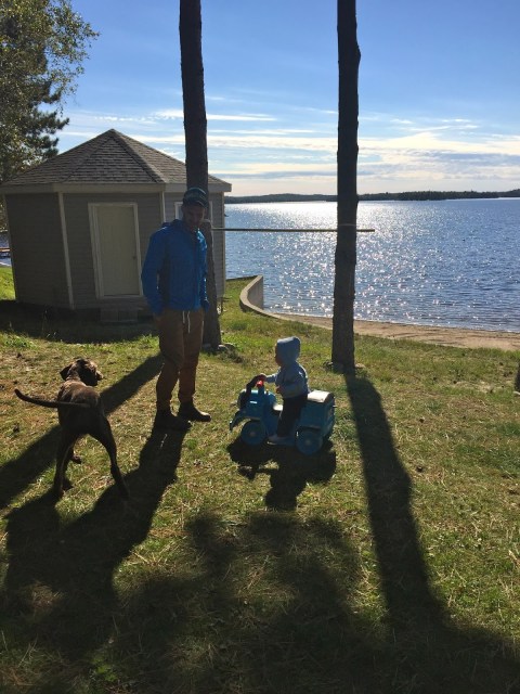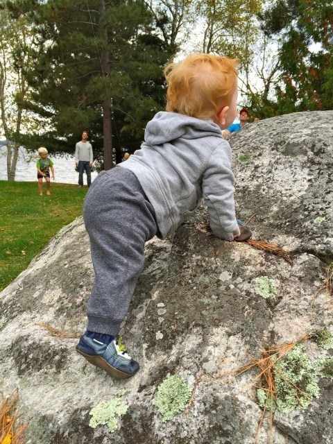 Fall is by far my favourite time of year, and so far, we haven’t been disappointed. We’ve been so lucky to have had many warm afternoons playing in the yard surrounded by beautiful fall colours contrasted by the sparkling blue lake. Henry is much more independent in his play now and loves to crawl around in the grass, inspecting pine needles, pinecones and other interesting finds. He’s also been lucky enough to have access to all of Brooks’ and Hunter’s toys. His favourite is a Thomas the train that he can sit on and drive around the yard. After a few weeks of one of us driving for him, Henry all of a sudden discovered how to push the button himself and away he went! Unfortunately, he still hasn’t mastered steering so it involves us chasing him around the yard so that he doesn’t crash! I was dying laughing the first time he did it, as he didn’t seem at all surprised or excited that he was self-zooming around the yard! Henry has also started to stand unassisted without holding onto anything, so I think that walking is not too far off now. He loves to charge around holding onto your hands or pushing a chair and he is CONSTANTLY on the go, so it will come as no surprise if one of these days (very soon) he just starts running around on his own!