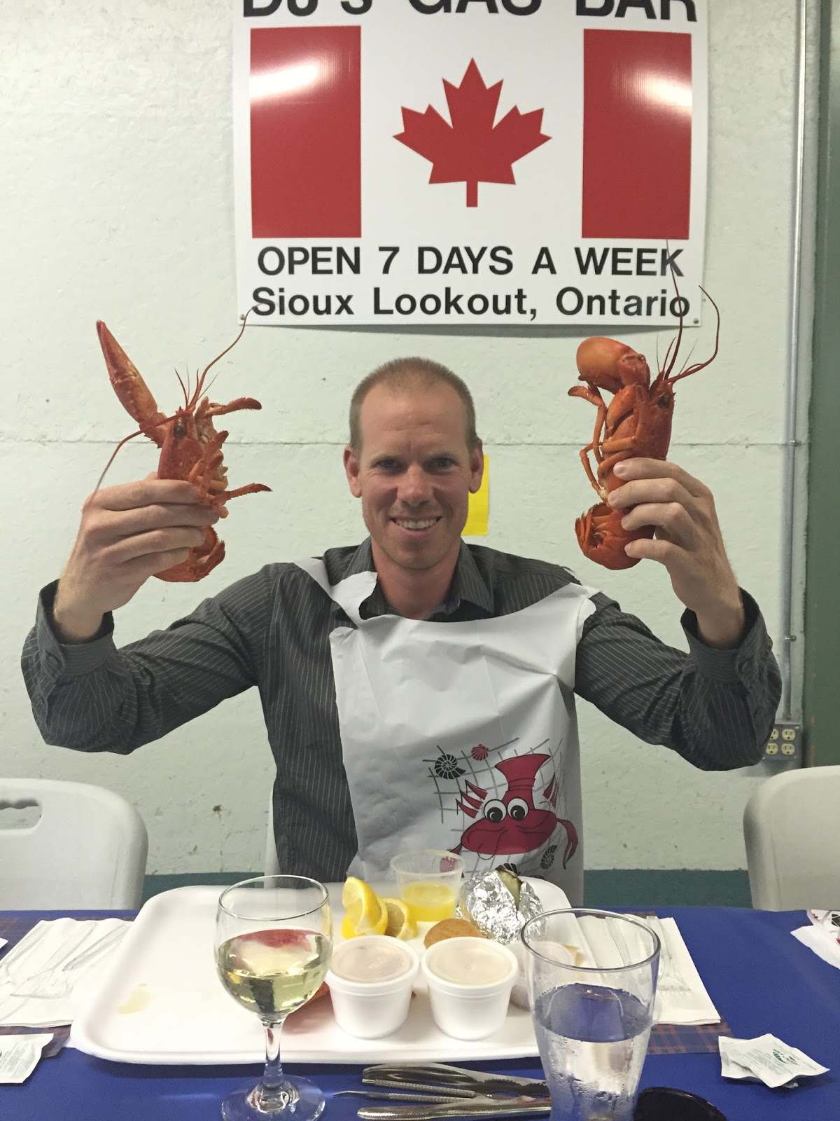 Blake and I out for a rare night alone to the community Lobsterfest where they were cooking up huge batches of lobster and loading them up with (appropriately for Sioux Lookout) a snow shovel!