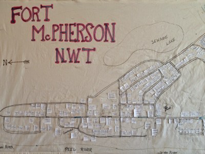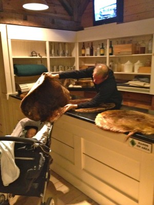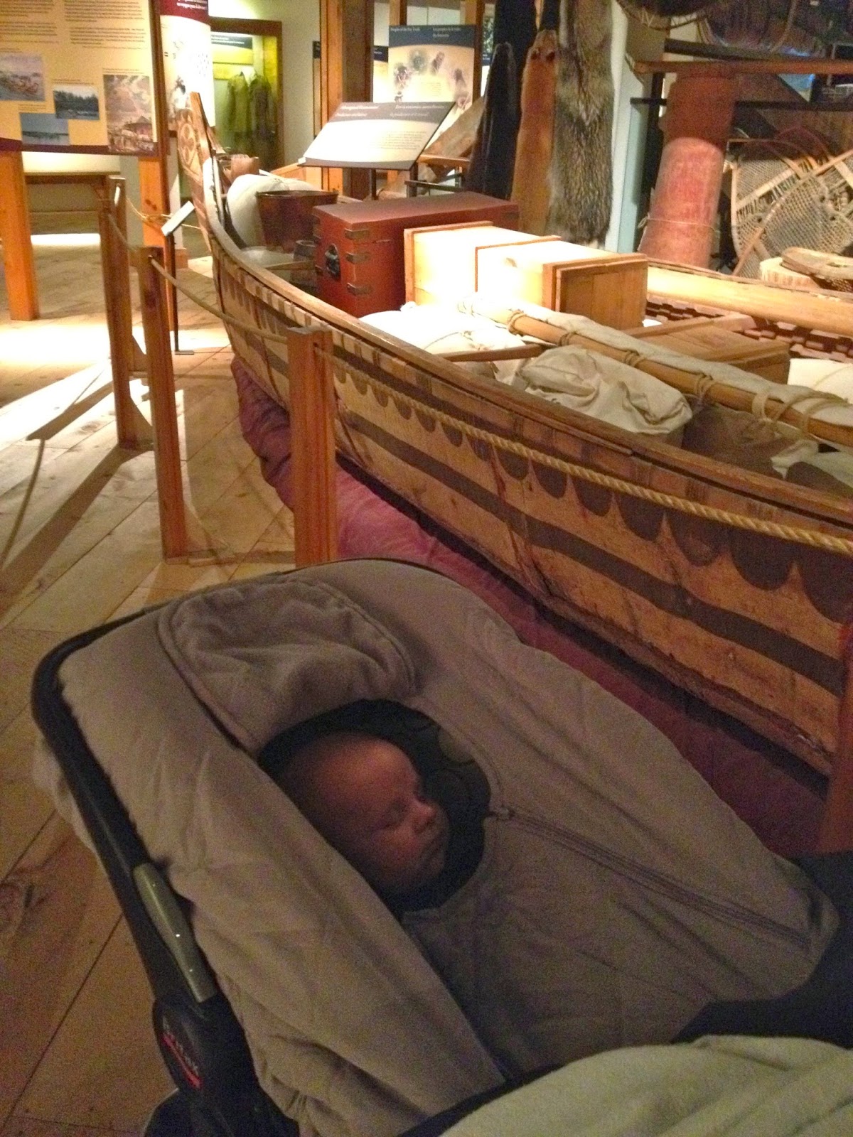 | Wearing the booties I bought for him when I was in Inuvik – they’re made from sealskin and arctic hare |
