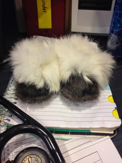 | The sealskin booties that I bought from an ER patient when I was about 13 weeks pregnant |