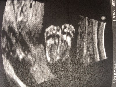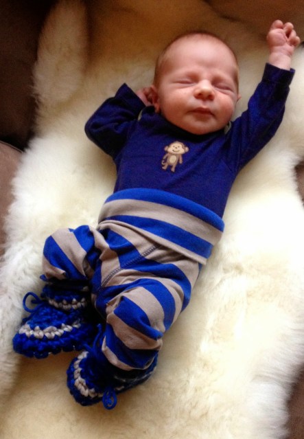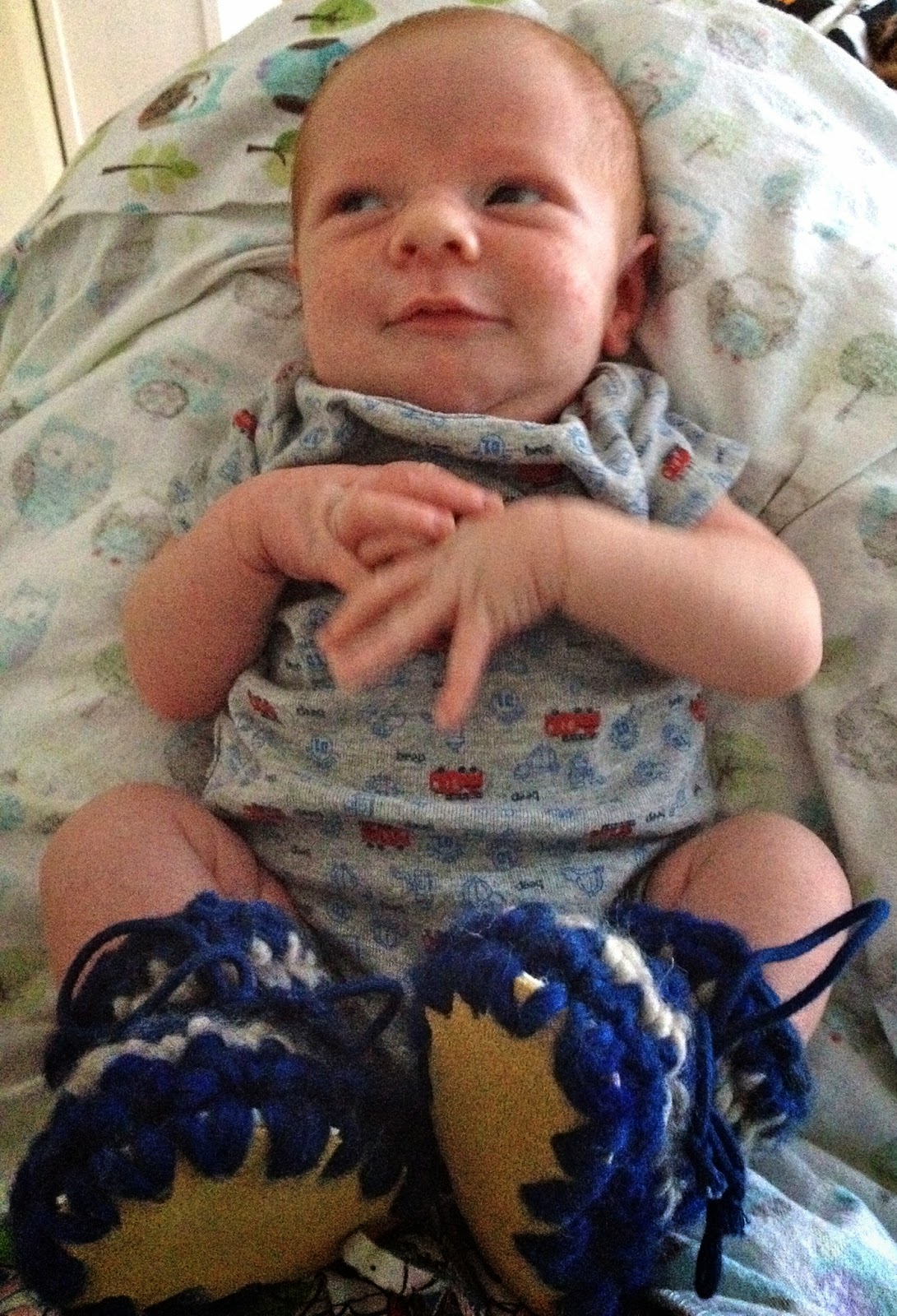 | Streeeetch!!!! Sporting the newborn booties from Julia & Travis 🙂 |
