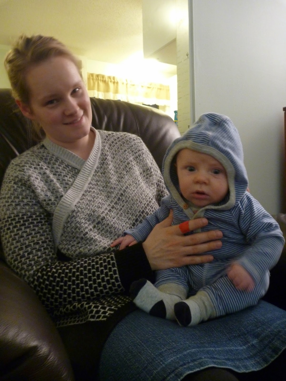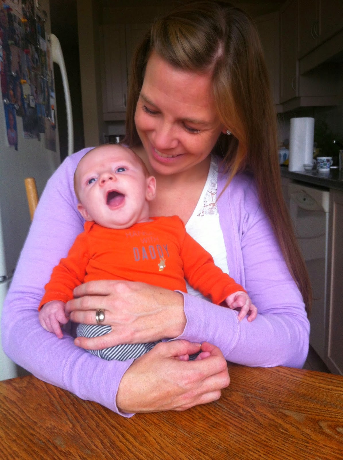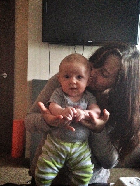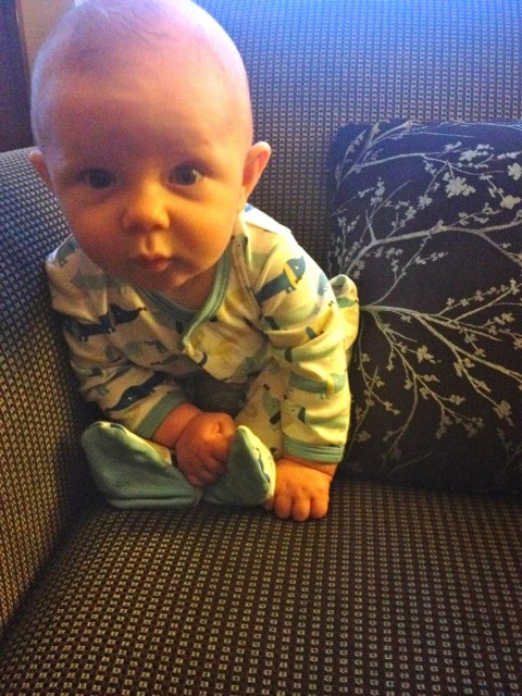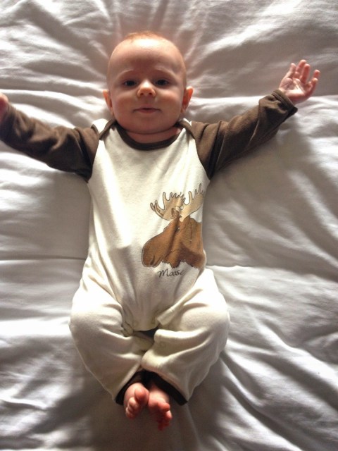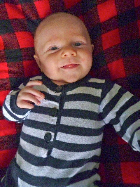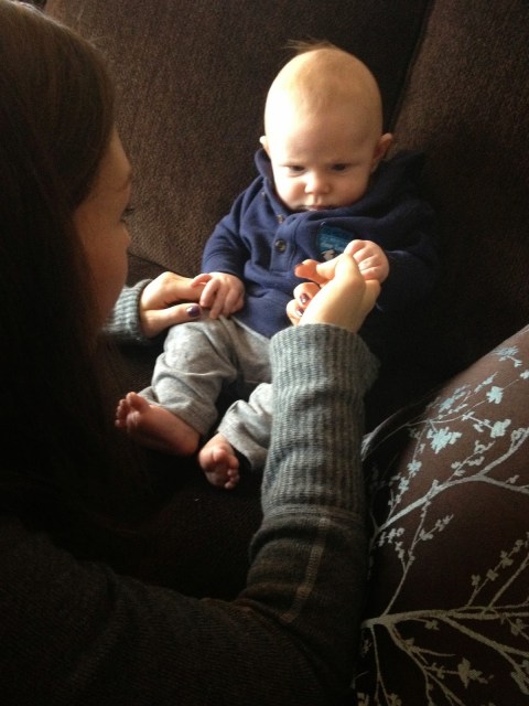 Aside from the progress in the sleep department, Henry keeps growing and changing in so many ways. He laughed for the first time a few days ago – a sound that any parent will do anything to hear again and again. Henry is also demonstrating feats of strength. He isn’t a big baby, but man is he ever strong! He loves to stand essentially on his own and recently, Blake will hold him up and he will support his own weight, hanging off of Blake’s thumbs. Henry has also ‘discovered’ his feet and will spend much time staring at his toes, so much so that if he is sitting on the couch doing so, he will eventually end up in a face plant in his eagerness to get closer to these strange creatures 🙂 Language-wise, he continues to coo and ‘sing’, especially while nursing which is adorable and endlessly entertaining.
