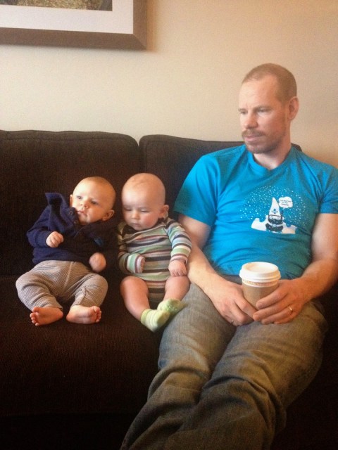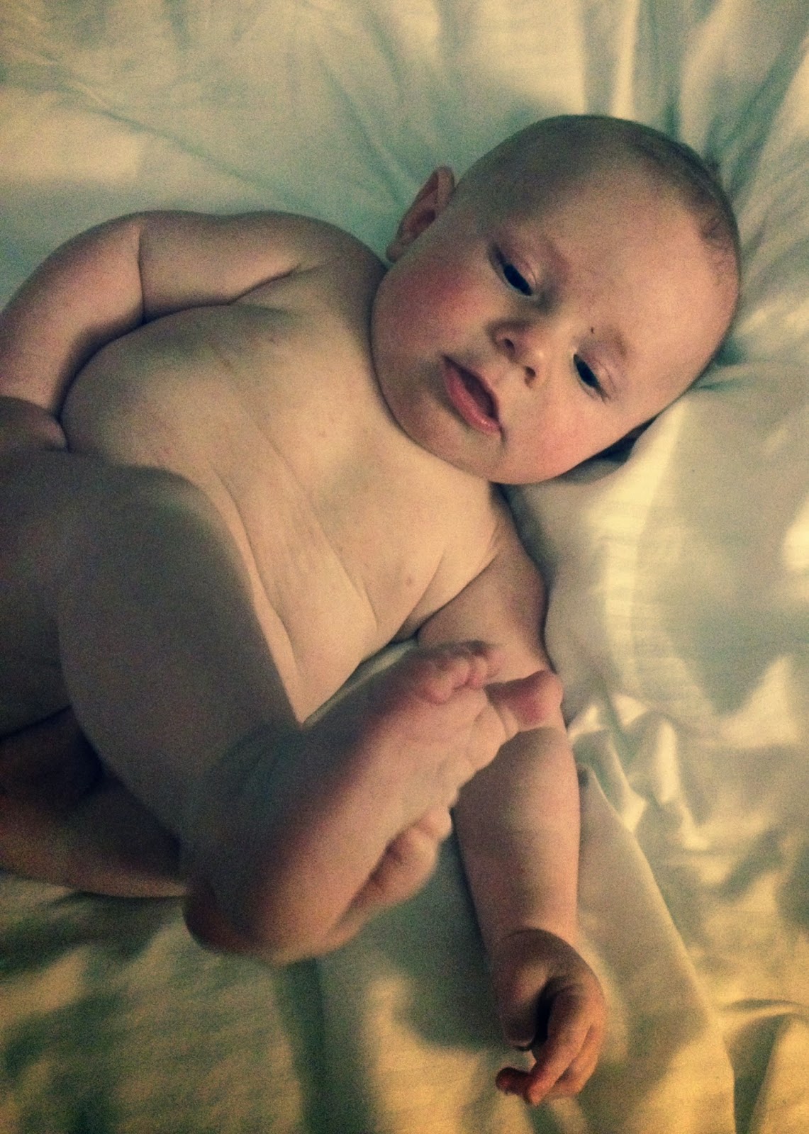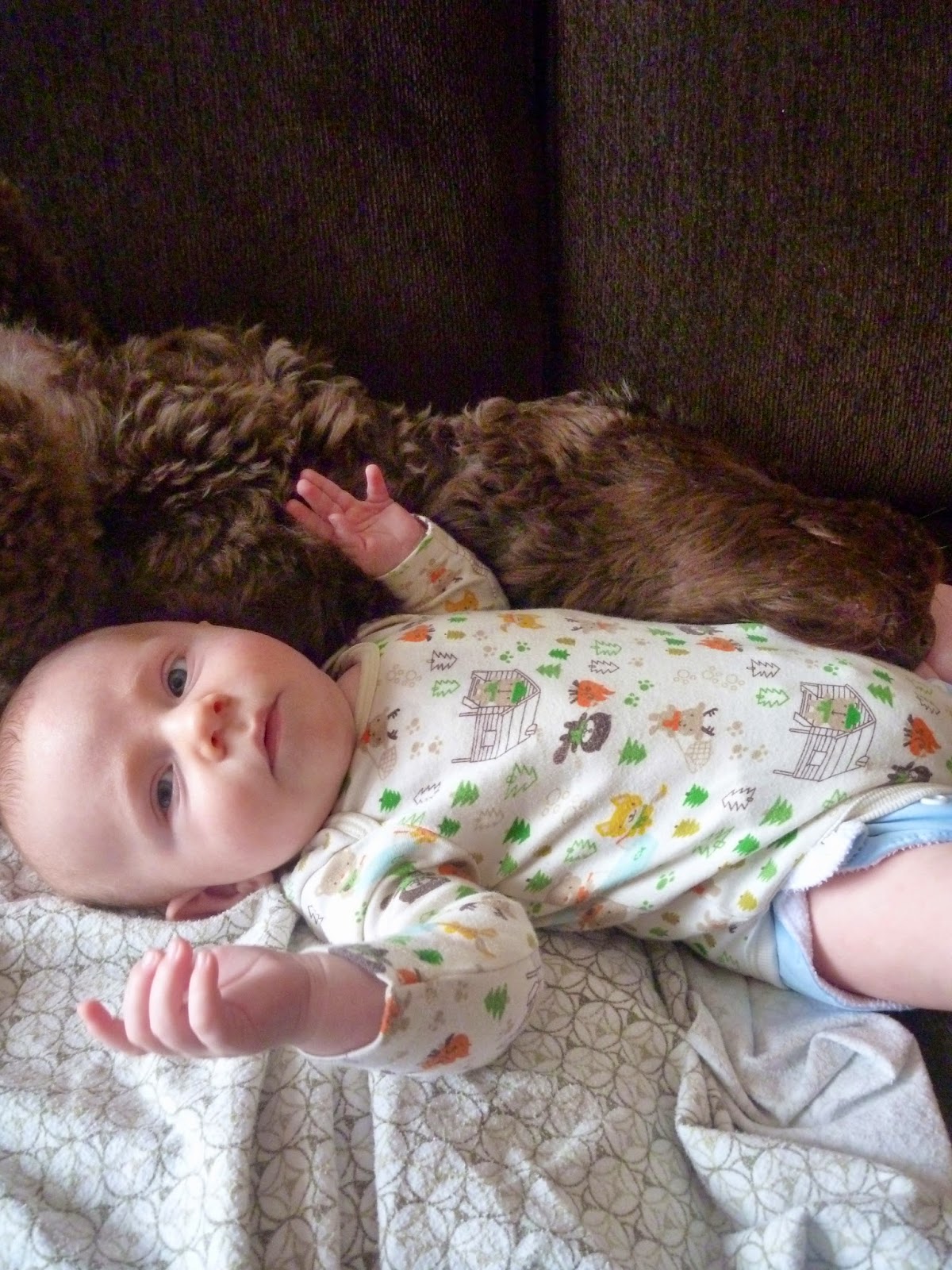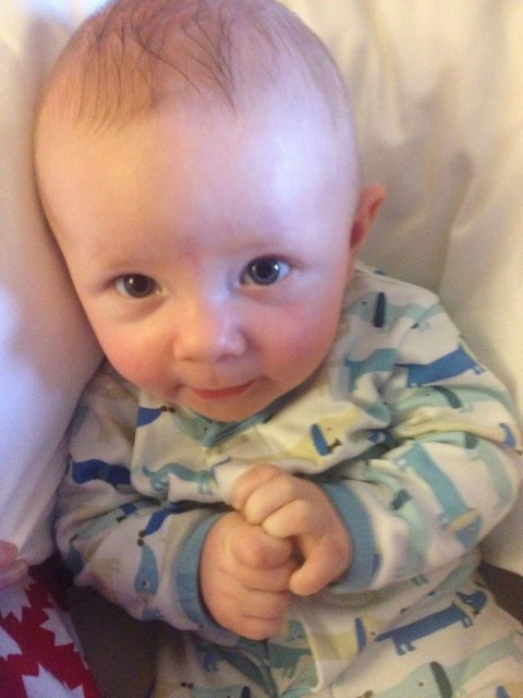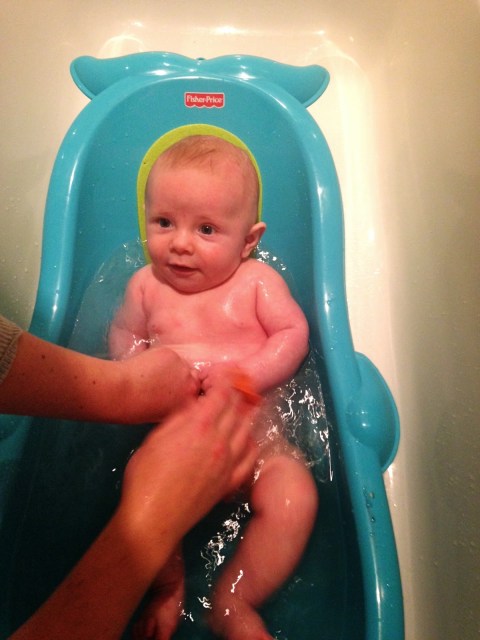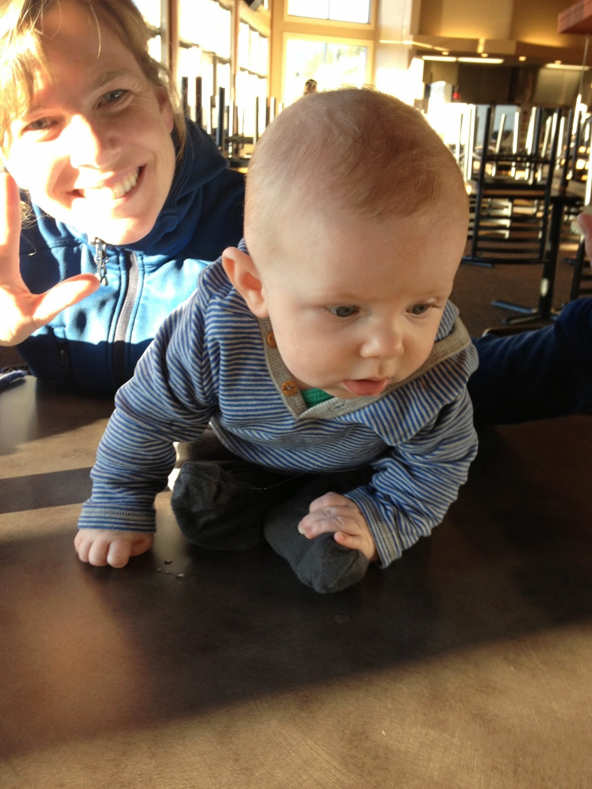 Aside from the progress in the sleep department, Henry keeps growing and changing in so many ways. He laughed for the first time a few days ago – a sound that any parent will do anything to hear again and again. Henry is also demonstrating feats of strength. He isn’t a big baby, but man is he ever strong! He loves to stand essentially on his own and recently, Blake will hold him up and he will support his own weight, hanging off of Blake’s thumbs. Henry has also ‘discovered’ his feet and will spend much time staring at his toes, so much so that if he is sitting on the couch doing so, he will eventually end up in a face plant in his eagerness to get closer to these strange creatures 🙂 Language-wise, he continues to coo and ‘sing’, especially while nursing which is adorable and endlessly entertaining.