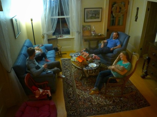 | Hanging out with our neighbours – I’m filing Henry’s nails while Blake plays with Ada and the kids |