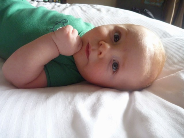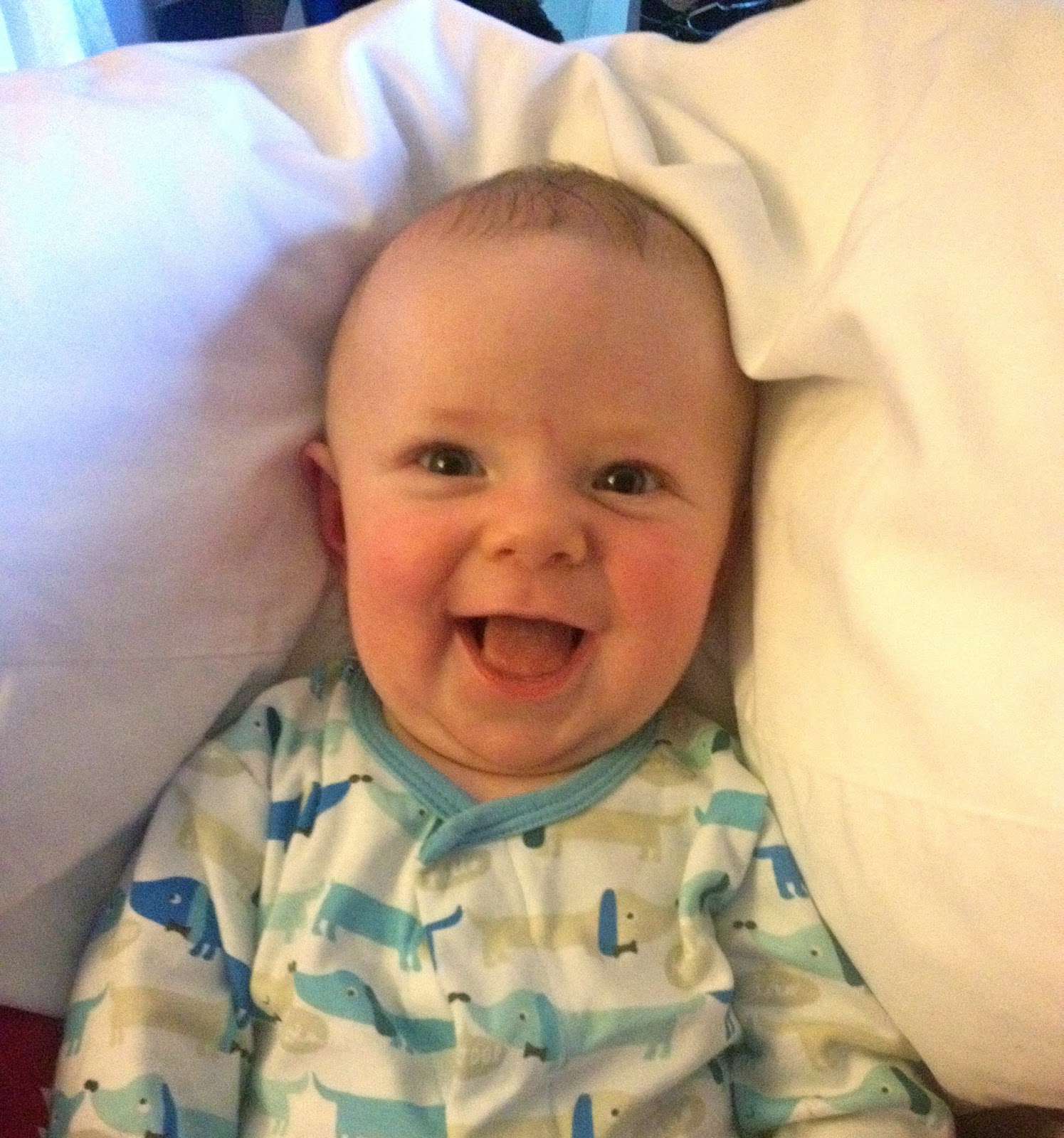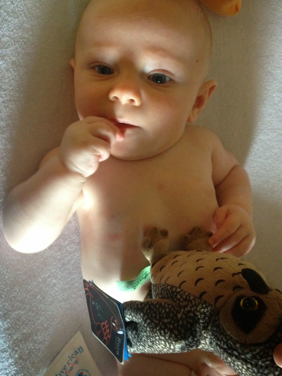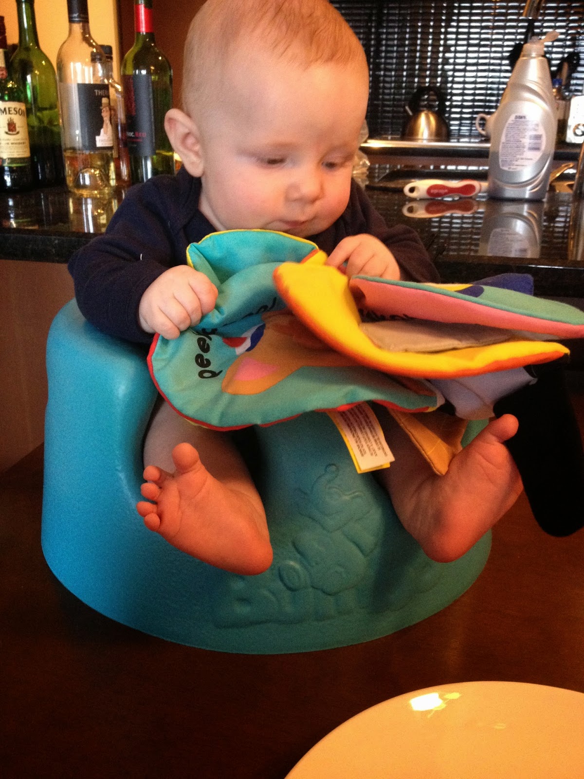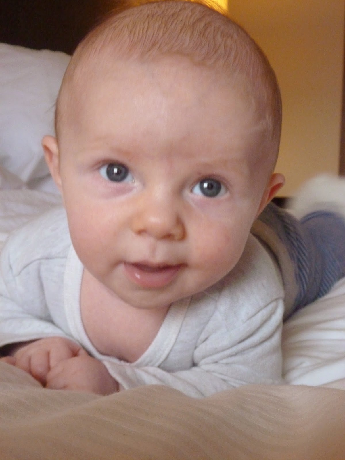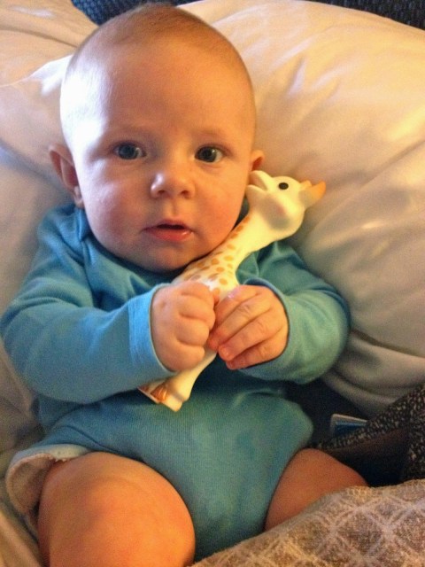 In terms of his motor development, he now can easily pick up a toy and put it in his mouth, roll from his back to his tummy, and when put on his belly, he will dig his toes in and push himself forward. Just a few days ago, he began to sit unassisted in a tripod position. Henry has also graduated from his bassinet to a crib and not infrequently, we will find him in flipped over and in a completely different end of the crib from where he started when he wakes from a nap. He is a mover!