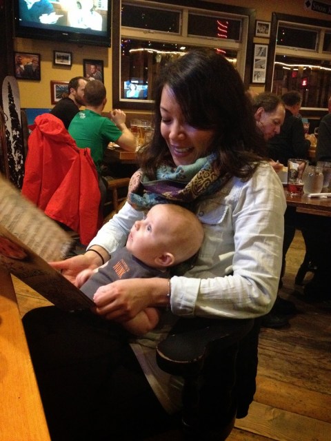 | Out for dinner at the Village Idiot – Henry was captivated by the ski movie playing on the big screen |