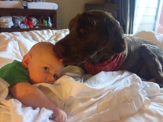 | Blake’s answer for a crying baby – attaching the dog’s leash to the bassinet and hanging it from the ceiling |