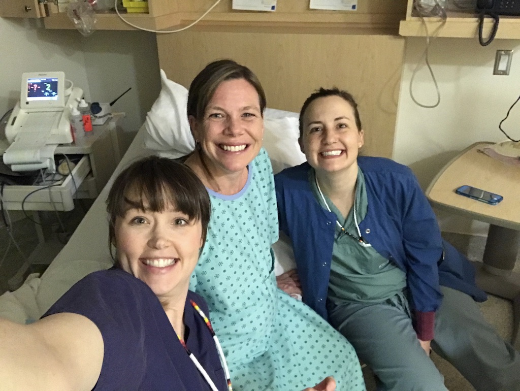 Within minutes of arriving to the hospital, Amy, Adam, Blake, Megan (who had previously offered herself as a non-clinical labour support for me) and Lianne were all in the room. With two physicians rubbing my back during each contraction, my fears of having an unattended delivery faded. The labour pains continued to come regularly but I was still able to chat and joke between them and was coping well. Surrounded by so many people, their faces all waiting expectantly as if I was going to drop a baby out any second, I remember feeling almost silly that things weren’t moving along faster!